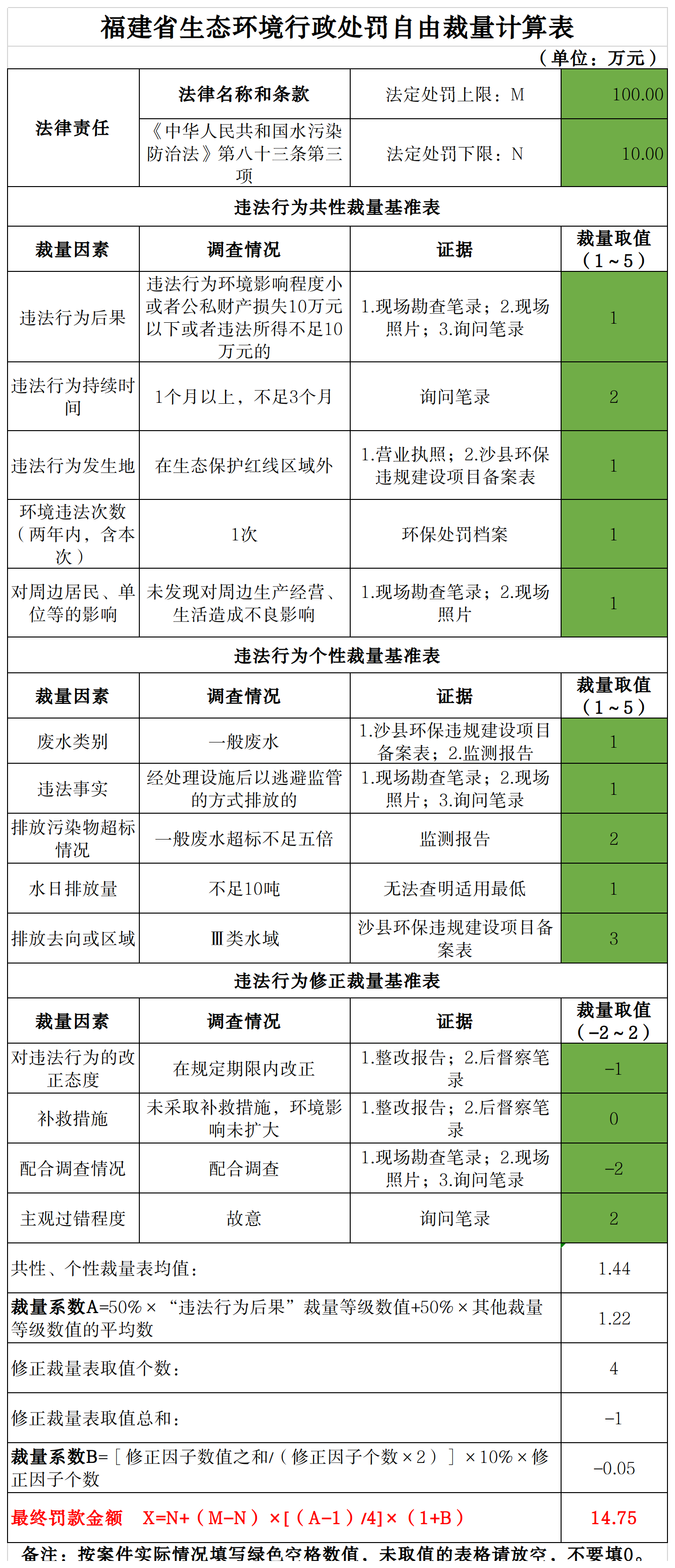 2.自由裁量得当。一是参照《福建省生态环境系统包容审慎监管执法清单不予处罚事项清单》第 5项不予处罚适用条件“超标排放大气污染物除有毒有害物质、放射性物质、重金属、持久性有机污染物之外,超标排放大气污染物(不含恶臭、机动车和非道路移动机械排放污染物、生活垃圾处理单位日均值和持久性有机污染物)仅有一项污染物超过规定排放标准且超标幅度不超过 10%,并在 3个工作日内改正的”的规定,你公司一级坑塘西南侧渗水化学需氧量浓度为 216mg/L,超过《农田灌溉水质标准》(GB 5084—2021)表 1 中旱地作物限值 0.08倍;氨氮浓度为 91.3mg/L、总磷浓度为 12.2mg/L,分别超过《畜禽养殖业污染物排放标准》(GB18596-2001)表 5 中的最高允许排放浓度0.14倍和 0.53倍的违法事实不符合危害后果轻微的情形。二是涉案处罚款是依据《福建省生态环境行政处罚裁量规则》共性、个性、修正裁量基准计算,每个裁量因素均有相应的证据予以证实,取值合法、适当。